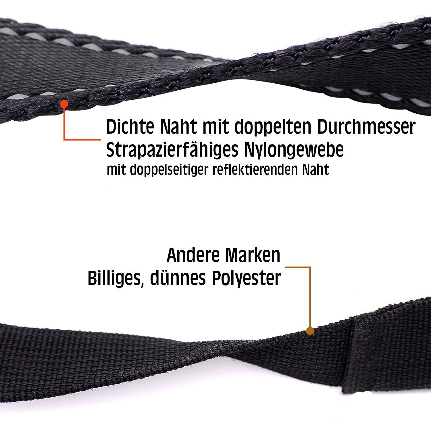 Unsere Hundeleine ist aus hochwertigem, strapazierfähigem, aber weichem Hochleistungsnylon gefertigt und verfügt über 2 Griffe. Die lange Leine ist perfekt für lockere Spaziergänge, ausgedehntes Schnüffeln und Spaziergänge an lockerer Leine, die kürzere Leine eignet sich hervorragend für Gehwege, Fahrradwege und belebte Bereiche, die eine sofortige Kontrolle aus nächster Nähe erfordern. Kann als Trainingshilfe verwendet werden, um Dominanz und Aggression zu kontrollieren.
